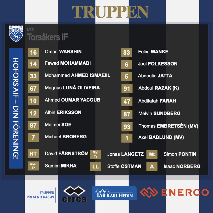 Alldeles strax avspark i kvällens match, vi hoppas att ni är på plats för att heja fram oss! Hofors AIF kommer med följande 16-manna trupp till match: Abdifatah Farah Abdoul Razak Abdoulie Jatta Ahmed Oumar Yacoub Albin Eriksson Axel Badlund Fawad Mohamadi Felix Wanke Joel Folkesson Magnus Lunå Oliveira Meimei Soe Melvin Sundberg Michael Broberg Mohammed Ahmed Ismaeiil Omar Warshin Thomas Embretsén Nu kör vi!