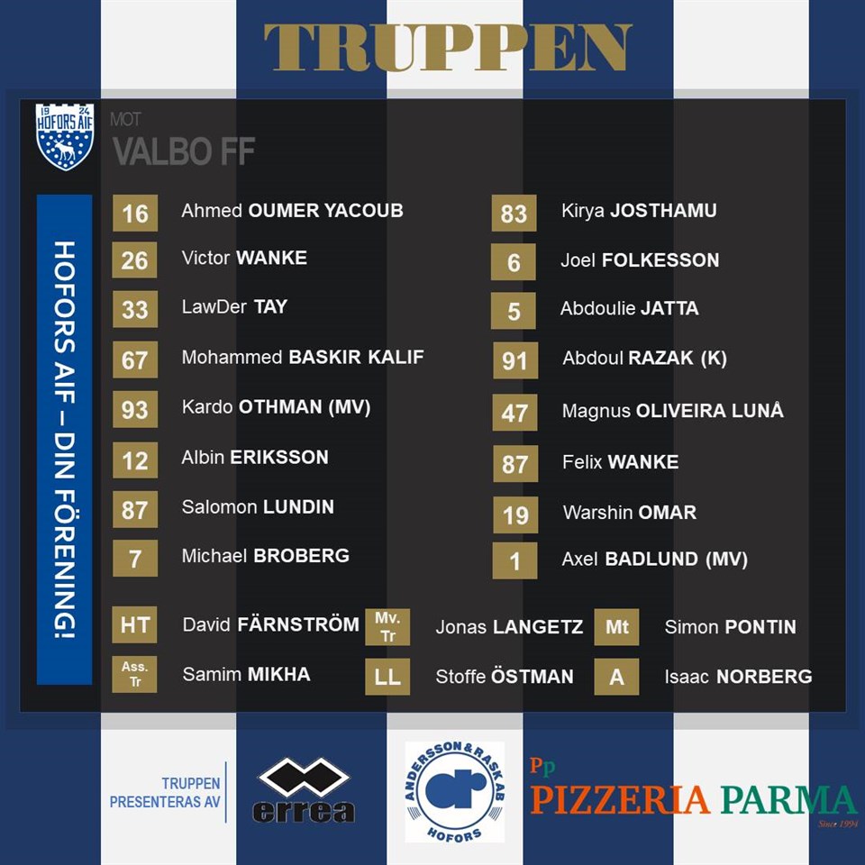 Klockan 20.00 när det avspark på Strömvallen mot Valbo FF, matchen följer du bäst på plats! Hofors AIF kommer med följande 16-manna trupp till match: Abdoul Razak (K) Abdoulie Jatta Ahmed Oumar Yacoub Albin Eriksson Axel Badlund (MV) Felix Wanke Joel Folkesson Kardo Othman (MV) Kirya Josthamu Law Der Tay Magnus Oliveira Lunå Michael Broberg Mohammed Baskir kalif Omar Warshin Salomon Lundin Victor Wanke Några ändringar i truppen sedan senaste matchen i fredags, och en seniordebut i kvällens match för Mohammed Baskir Kalif!