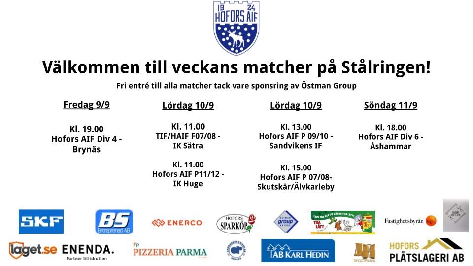 Idag inleder vi matchhelgen på Stålringen med match i div. 4 mellan Hofors AIF och Åbyggeby. På söndag är det en heldag med fotboll på konstgräsplanen. Våra 2 st. yngsta lag som spelar matcher flickor och pojkar födda 2013/2014 har seriesammandrag. Flickorna börjar sina matcher kl.10.00 och pojkarna kl.13.00. Matcherna spelas i spelformen 5 mot 5. Matchhelgen avslutas med 2 st. 9 mot 9 matcher, kl. 15.00 spelar P 09/10 och kl. 17.00 är det F 09/10 som spelar mot Stensätra. Varmt välkommen till Stålringen! Mvh Hofors AIF