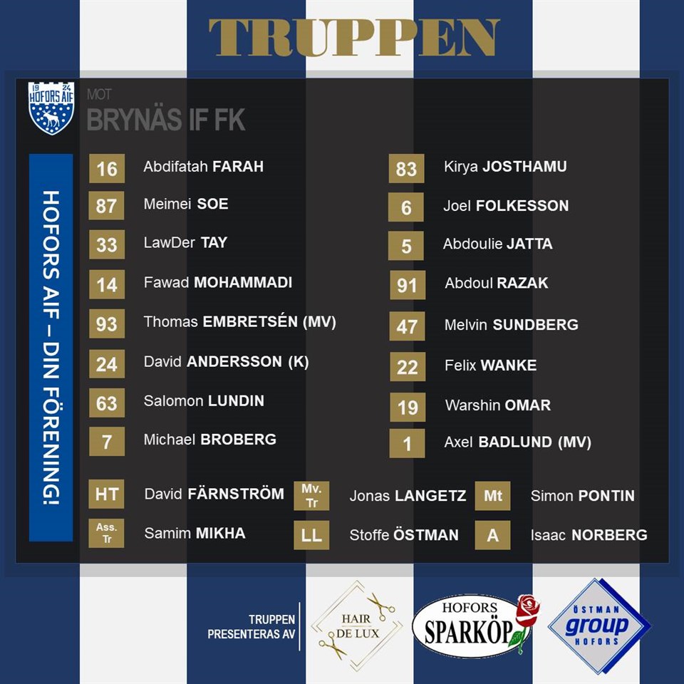 Klockan 19.00 är det dags för hemmamatch igen. Matchen spelas på konstgräset och för motståndet står Brynäs IF FK för! Hofors AIF kommer med följande 16-manna trupp till match: Abdifatah Farah Abdoul Razak Abdoulie Jatta Axel Badlund (MV) David Andersson Fawad Mohamadi Felix Wanke Joel Folkesson Kirya Josthamu Law Der Tay Meimei Soe Melvin Sundberg Michael Broberg Omar Warshin Salomon Lundin Thomas Embretsén (MV) Så bege Dig till Stålringen i kväll för höstunderhållning, vi behöver Ditt stöd i jakten på tre poäng!