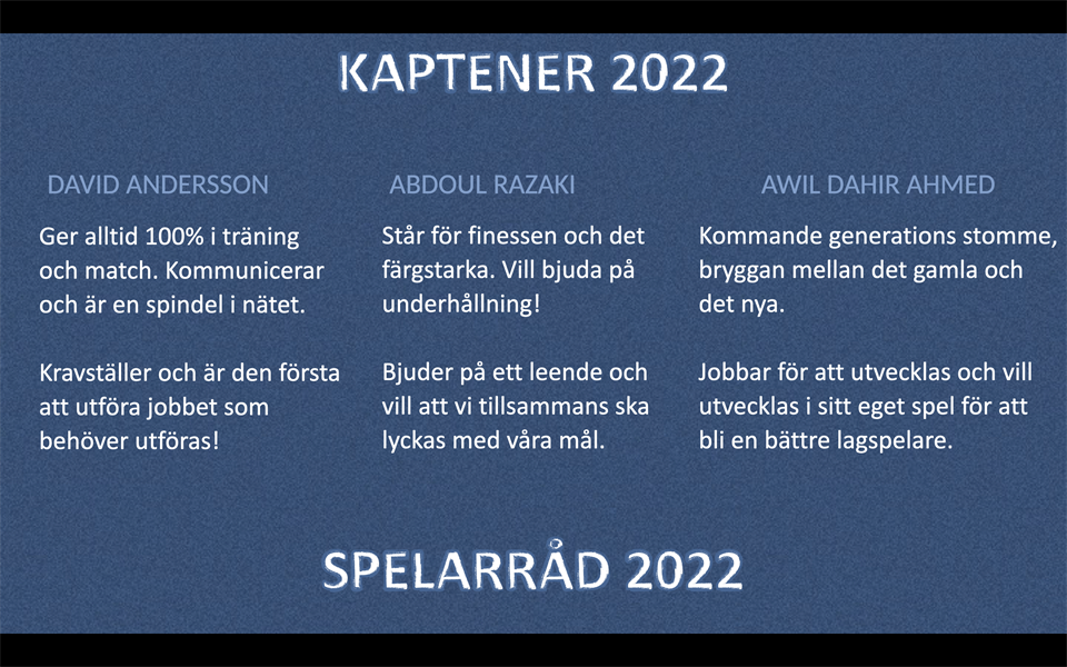 Till säsongen 2022 har herrlaget tre stycken kaptener, som också kommer att fungera som ett spelarråd för gruppen! Kaptener och spelarråd 2022 är David Andersson, Abdoul Razaki och Awil Dahir Ahmed. Med följande motiveringar har dessa tre blivit utvalda att bära kaptensbindeln 2022: David Andersson Ger alltid 100% i träning och match. Kommunicerar och är en spindel i nätet. Kravställer och är den första att utföra jobbet som behöver utföras! Abdoul Razaki Står för finessen och det färgstarka. Vill bjuda på underhållning! Bjuder på ett leende och vill att vi tillsammans ska lyckas med våra mål. Awil Dahir Ahmed Kommande generations stomme, bryggan mellan det gamla och det nya. Jobbar för att utvecklas och vill utvecklas i sitt eget spel för att bli en bättre lagspelare.