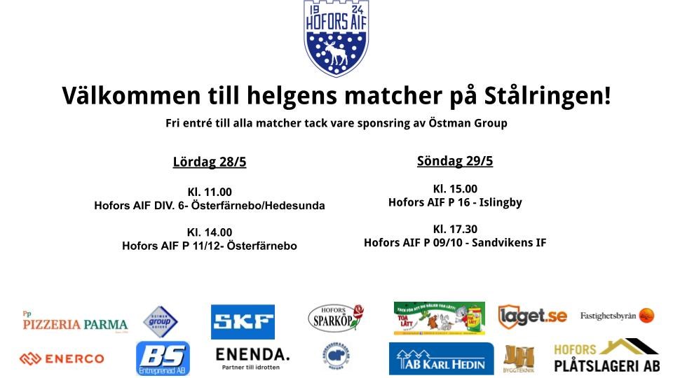 I kväll är det återigen dags för hemmamatch på Stålringen, avspark klockan 19.00 - var på plats i god tid! Hofors AIF kommer med följande 16-manna trupp till match: Abdoul Razak Abdoulie Jatta Albin Eriksson Axel Badlund Axel Lindholm David Andersson Fawad Mohamadi Felix Wanke Joel Folkesson Kirya Josthamu Magnus Oliveira Lunå Meimei Soe Michael Broberg Mohammed Ahmed Ismaeeil Salomon Lundin Samuel Nilsson Hofors AIF hälsar gästerna, domare och publik varmt välkomna till match i Gestriklands division 4 på Stålringen. Östman Group ser säsongen 2022 till att vi har FRI ENTRÉ på Stålringen och kiosken serverar go' fika med kaffe och körv bland mycket annat!