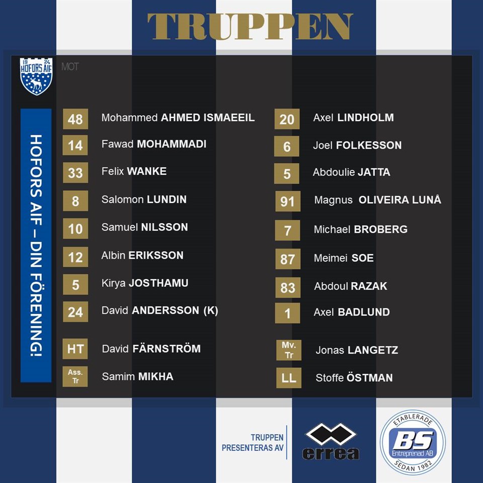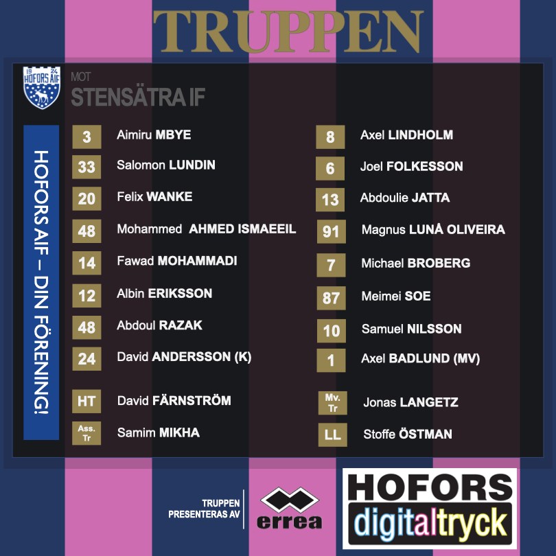 I kväll möter vi Stensätra IF borta på Skogsvallen, avspark 19.00! Hofors AIF kommer med följande 16-manna trupp till match: Abdoul Razak Abdoulie Jatta Albin Eriksson Axel Badlund Axel Lindholm Aimiru Mbye David Andersson Fawad Mohamadi Felix Wanke Joel Folkesson Magnus Oliveira Lunå Meimei Soe Michael Broberg Mohammed Ahmed Ismaeeil Salomon Lundin Samuel Nilsson