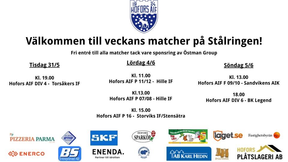 Hej! Det har som vanligt varit en vecka fylld med aktiviteter i vår förening. Förra vecka var det sammanlagt runt 40 st. aktiviteter, träningar, matcher eller något annat arrangeman där vår förening var representerad. Kommande veckas matcher finns på bilden i den här nyheten. Träningarna kör på som vanligt och vi hälsar alla aktiva, ledare, föräldrar och andra intresserade välkomna till Stålringen till både match och träning. Ha det så bra! Mvh Hofors AIF/Johanna Grönlund