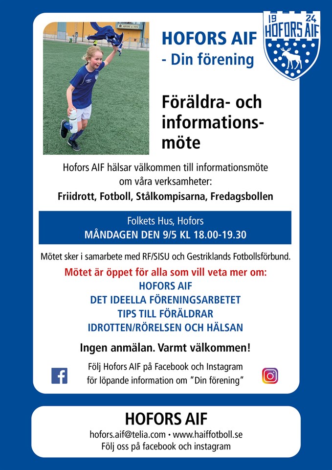 Hofors AIF bjuder in medlemmar, föräldrar, aktiva, ledare och alla som är intresserade av att veta mer om våra verksamheter till ett informationsmöte den 9/5 kl. 18.00 - ca 19.15 på Folketshus i Hofors. Mötet genomförs i samarbete med Riksidrottsförbundet/SISU Gävleborg och Gestriklands Fotbollsförbund. Vi kommer bland annat att informera om vad som händer i föreningen just nu och berätta om våra olika aktiviteter, vad vi drömmer om och hur vi ser på framtiden. Vi kommer att belysa vikten av det ideella engagemanget och föräldrarnas roll i sitt barns idrottande. Hofors AIF är en ideell idrottsförening med syfte att ge barn och ungdomar möjlighet till en aktiv vardag. Vi vill inspirerar barn och ungdomar till träning och rörelse. Hos oss skapas förutsättningar för barn och ungdomar att bli del av ett sammanhang, bli sedda, utvecklas och få förebilder för livet. Då psykisk och fysisk ohälsa ökar bland barn och ungdomar genom den allt mer stillasittande vardagen är det vi gör viktigare än någonsin. Vi vill fortsätta driva och utveckla en förening som gör skillnad för barn och ungdomar i Hofors. Vi ser fram emot att träffa alla som är intresserade av att veta mer om vår/sin förening! Vi ses på "Folkan". Mvh Johanna Grönlund, ordförande