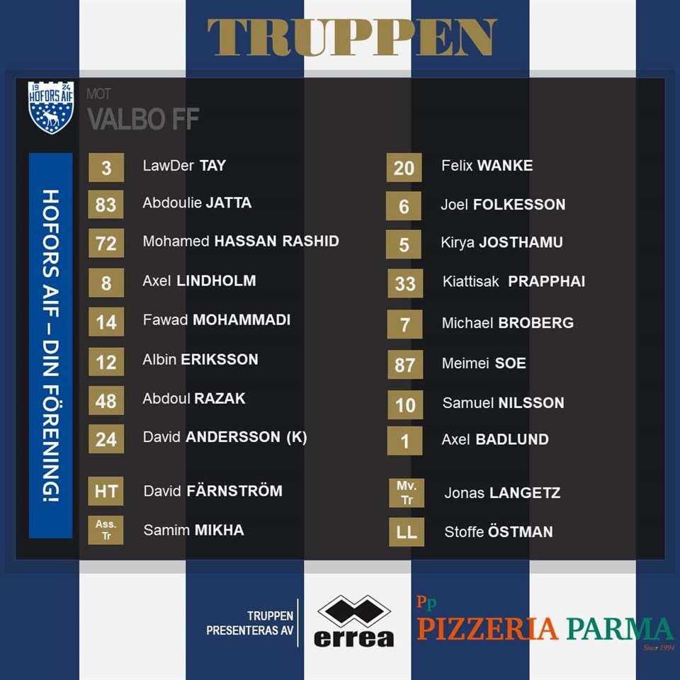 I kväll väntar match mot Valbo FF hemma på Stålringen, avspark 19.00. Valbo FF kommer senast från en 3-0 seger i premiären, Hofors AIF kommer till match med 1-1 senast mot Älvkarleby IK. Senast lagen möttes var under försäsongen hemma på Stålringen, Valbo gick segrande ur den matchen med 4-9 (1-4). Hofors AIF kommer med följande 16-manna trupp till match: Abdoul Razak, Abdoulie Jatta, Albin Eriksson, Axel Badlund, Axel Lindholm, David Andersson, Fawad Mohammadi, Felix Wanke, Joel Folkesson, Kiattisak Prapphai, Kirya Josthamu, LawDer Tay, Meimei Soe, Michael Broberg, Mohamed Hassan Rashid, Samuel Nilsson. Med i truppen för första gången i år är Abdoulie Jatta och Axel Lindholm som gör sina premiärer i kväll. Hofors AIF hälsar gästande Valbo FF, domare och publik varmt välkomna till match i Gestriklands division 4 på Stålringen. Fri entré och kiosken serverar go' fika och kaffe!