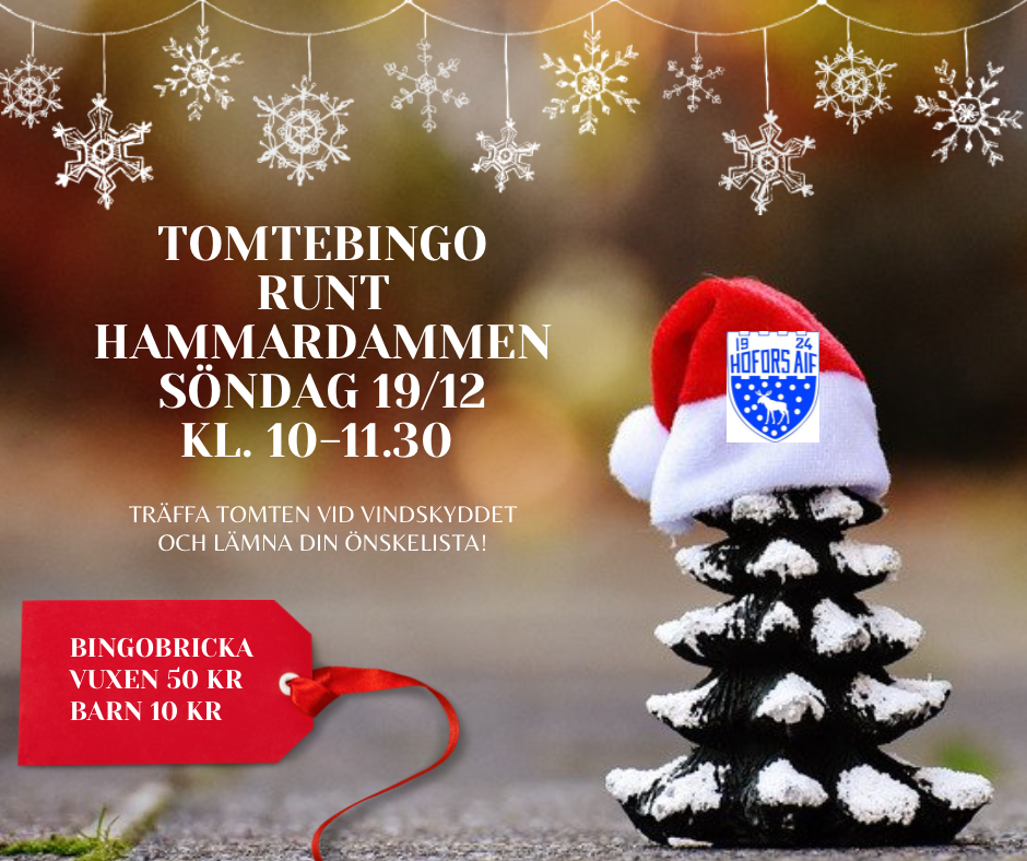 På söndag hälsar HAIF varmt välkommen till motionsbingo runt Hammardammen kl.10-11.30. Vi säljer bingobrickor vid gula villan, 50 kr för vuxen o 10 kr för barn. Vid vindskyddet kommer man att få träffa tomten och lämna sin önskelista. Mvh Hofors AIF