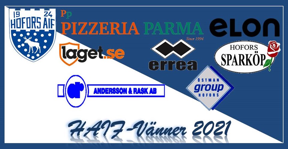 Under de inledande månaderna av året så har vi initierat kontakt med företag och organisationer och vi är mycket glada att nu kunna presentera de företag som under 2021 kommer att vara en del av HAIF-Familjen! Vi har idag en träningsavgift som alla våra aktiva ska betala, för att hålla den på en nivå som vi anser att alla kan ha råd med så behöver vi stöd från organisationer och näringsliv. Detta är en av de största anledningarna till att vi söker samarbeten med företag. Vi vill att föreningslivet ska leva och att alla som vill ska kunna vara med i Hofors AIF, oavsett ekonomiska förutsättningar. Företag och organisationer som 2021 är HAIF-vänner: Andersson och Rask, Elon Hofors, Hofors Sparköp, Pizzeria Parma, Östman Invest. Hofors Sparköp och Pizzeria Parma kommer också att synas på matchställen kommande säsonger! Vi är oändligt tacksamma för det stöd som ni ger föreningen under säsongen 2021 och att ni vill vara en del av vår verksamhet! Fler HAIF-vänner kommer att presenteras fortlöpande och vi ser fram emot att presentera fler företag och organisationer som året 2021 kommer att vara en del av den stora och fina HAIF-familjen.