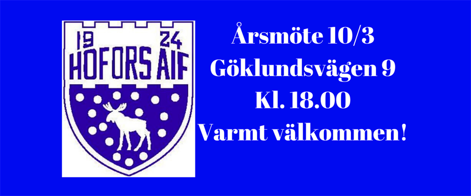 Tisdagen den 10/3 är det årsmöte i Hofors AIF. Mötet startar kl. 18.00 och vi håller till i kanslilokalen på Göklundsvägen 9. Efter mötet bjuder vi på kaffe och gofika. Du kan beställa årsmöteshandlingarna på hofors.aif@telia.com. Handlingarna kommer även att finnas tillgängliga på årsmötet men i begränsad upplaga, av ekonomiska och miljömässiga skäl. Varmt välkommen till mötet. Mvh Styrelsen Hofors AIF.