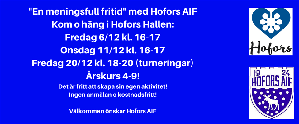 På samma vis som Stålringen är tillgänglig och öppen för spontanidrott under sommaren vill Hofors AIF "öppna" Hofors Hallen för spontanfotboll och/eller andra aktiviteter för barn och ungdomar i årskurs 4-9. De tider som är bokade i Hoforshallen är: Fredag 6/12 kl.16-17 Onsdag 11/12 kl. 16-17 Fredag 20/12 kl. 18-20 (små turneringar) Det kommer att finnas tillgång till fotbollar och vissa redskap. Det är fritt att skapa sin egen aktivitet! Ingen föranmälan behövs och aktiviteterna är kostnadsfria. Datum för aktiviteter 2020 meddelas i samban med skolstart i januari. Samarbetspartners i "En meningsfull fritid" är Länsförsäkringars samhällsfond, Sisu Idrottsutbildarna och Hofors Kommun.