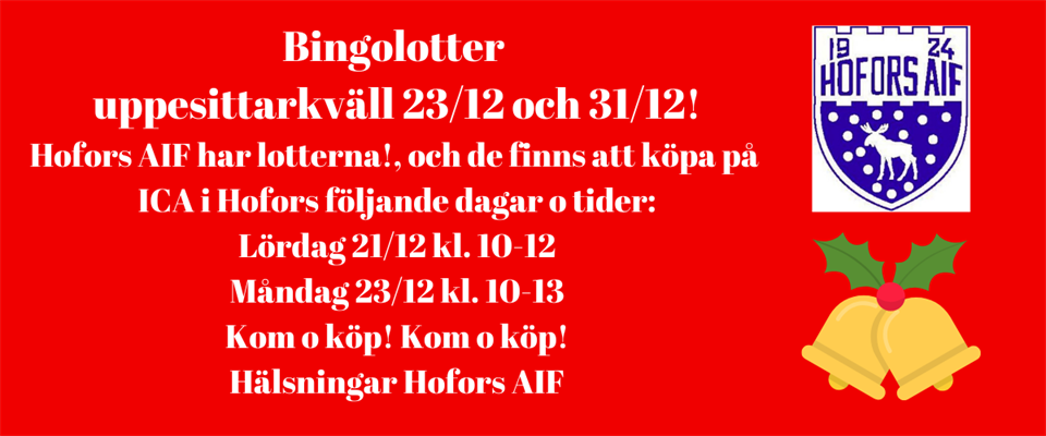 Hofors AIF säljer bingolotter till den 23/12 och 31/12. Vi finns på ICA i Hofors 21/12 kl. 10-12 och 23/12 kl. 10-13. Mvh Hofors AIF