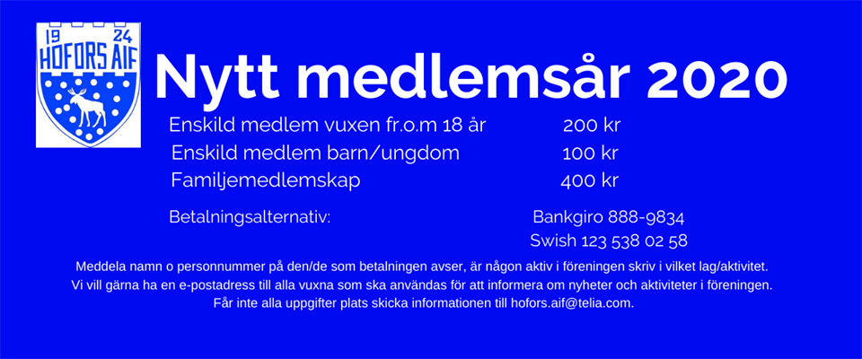 Vi välkomnar gamla och nya medlemmar med in i det nya verksamhets året 2020. Medlemmarna är föreningens främsta tillgång och den kärna som ska besluta om och organisera föreningens verksamhet. Det är en styrka i en förening att ha intresserade och engagerade medlemmar, som vill vara delaktiga i att både förvalta och utveckla verksamheten. Vi håller våra medlemmar i HAIF uppdaterade om vad som händer och är på gång i vår verksamhet genom ett nyhetsbrev som skickas ut efter varje styrelsemöte. Ange din e-post adress i samband med betalning av medlemsavgiften så kommer du att få nyhetsbrevet. Alla nyhetsbrev finns att läsa under fliken dokument på första sidan på hemsidan. Boka in datum o tid för årsmötet, 10/3 kl. 18.00 på Göklundsvägen 9. Frågor angående medlemsavgiften, medlemskap och vår verksamhet får du gärna ställa till Johanna Grönlund på messenger, sms eller ringa till 070-5120735. Önskar en fortsatt fin fredag och en trevlig helg! Mvh Hofors AIF styrelse gm Johanna Grönlund
