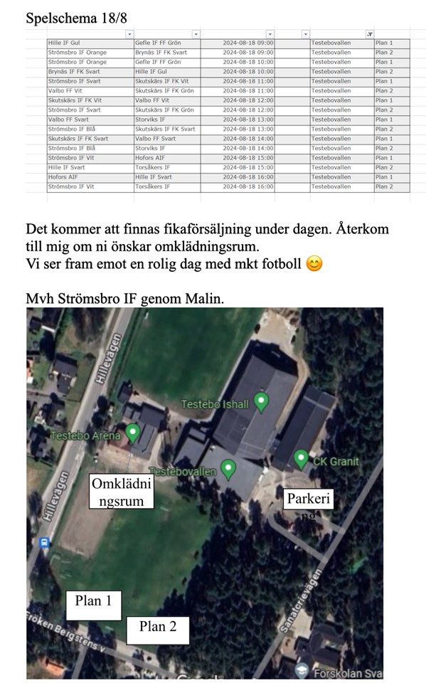 Denna vecka så är det sammandrag i Gävle på Testebovallen. Matcherna som ska spelas är: Kl.15.00 Strömsbro vit - Hofors Kl.16.00 Hofors - Hille IF Vi samlas vid stålringen 13.30 för utlämning av matchkläder. Om någon åker direkt in till Gävle så kommentera det i inlägget. Kom ihåg att svara på kallelsen senast fredag 16/8 så vi vet hur många som kan vara med. P 2015 11 aug 2024 1kommentar